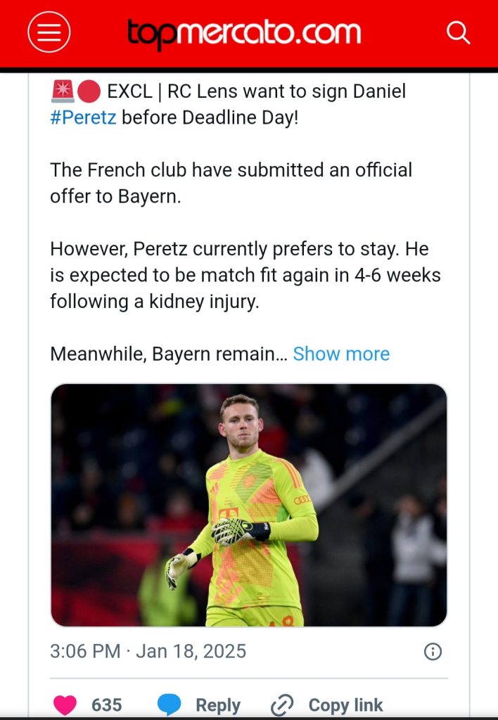 Une offre officielle aurait été transmise au Bayern Munich pour Daniel Peretz, bien que le montant de cette proposition n’ait pas été dévoilé.