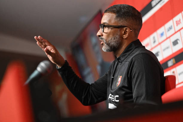 Rennes’ Senegalese head coach Habib Beye talks to journalists during a press conference after being appointed new head coach, at the Roazhon Park stadium in Rennes, on January 31, 2025. (Photo by Sebastien Salom-Gomis / AFP) (Photo by SEBASTIEN SALOM-GOMIS/AFP via Getty Images)