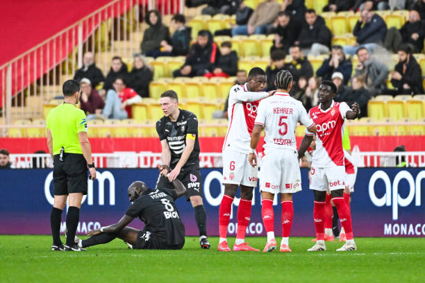 Seko FOFANA of Rennes and Adrien TRUFFERT of Rennes and Team of Monaco during the Ligue 1 MCDonald’s match between Monaco and Rennes at Louis II Stadium on January 25, 2025 in Monaco, Monaco. (Photo by Pascal Della Zuana /Icon Sport via Getty Images)