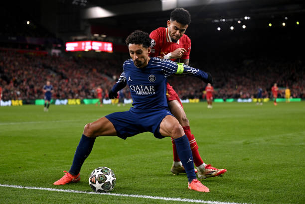 LIVERPOOL, ENGLAND – MARCH 11: (SUN OUT, SUN ON SUNDAY OUT) Marquinhos of Paris Saint-Germain holds off Luis Diaz of Liverpool during the UEFA Champions League 2024/25 Round of 16 Second Leg match between Liverpool FC and Paris Saint-Germain at Anfield on March 11, 2025 in Liverpool, England. (Photo by Liverpool FC/Liverpool FC via Getty Images)