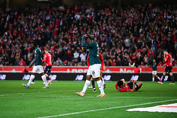Jeremy AGBONIFO of Lens looks dejected during the Ligue 1 McDonald’s match between Lille and Lens at Stade Pierre Mauroy on March 30, 2025 in Lille, France. (Photo by Baptiste Fernandez/Icon Sport via Getty Images)