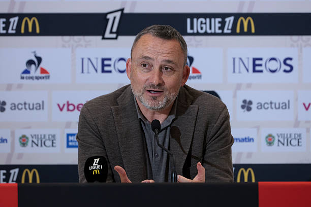 NICE, FRANCE – APRIL 6: Coach of OGC Nice Franck Haise speaks to the media during the post-match press conference following the Ligue 1 football match between OGC Nice (OGCN) and FC Nantes at Allianz Riviera on April 6, 2025 in Nice, France. (Photo by Jean Catuffe/Getty Images)