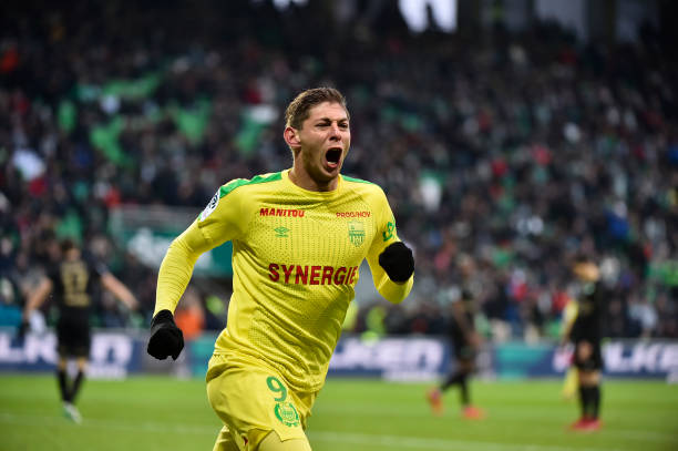 Nantes’ Argentinian forward Emiliano Sala celebrates after scoring a goal during the French L1 football match between Saint-Etienne (ASSE) and Nantes (FCN) on December 3, 2017, at the Geoffroy Guichard stadium in Saint-Etienne, central-eastern France. / AFP PHOTO / ROMAIN LAFABREGUE (Photo credit should read ROMAIN LAFABREGUE/AFP via Getty Images)